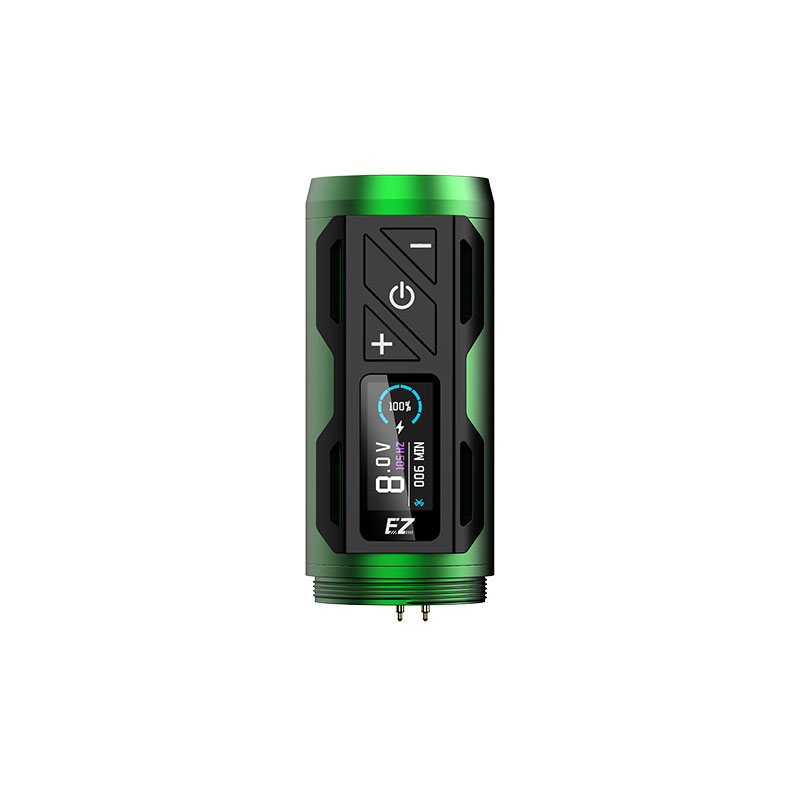 Das EZ Power Pack ist für den Wireless Tattoo Pen P2S Pro, damit auf keinen Fall der Saft ausgeht. Man kann mit dem Akku ca. 4,5 Stunden je nach Arbeitsweise Tätowieren. Die Ladezeit beträgt 2 Stunden. Zur Sicherheit gibt die digitale LED-Anzeige auf dem Display Auskunft über die bisherige Arbeitszeit, die Kapazität und die Arbeitsspannung. Mit den + und - Tasten kann die Spannung schrittweise eingestellt werden. Einfach kurz Drücken und die Spannung wird um 1 V entweder erhöht oder gesenkt. Durch langes Drücken kann sie in 0,5 V Schritten eingestellt werden.