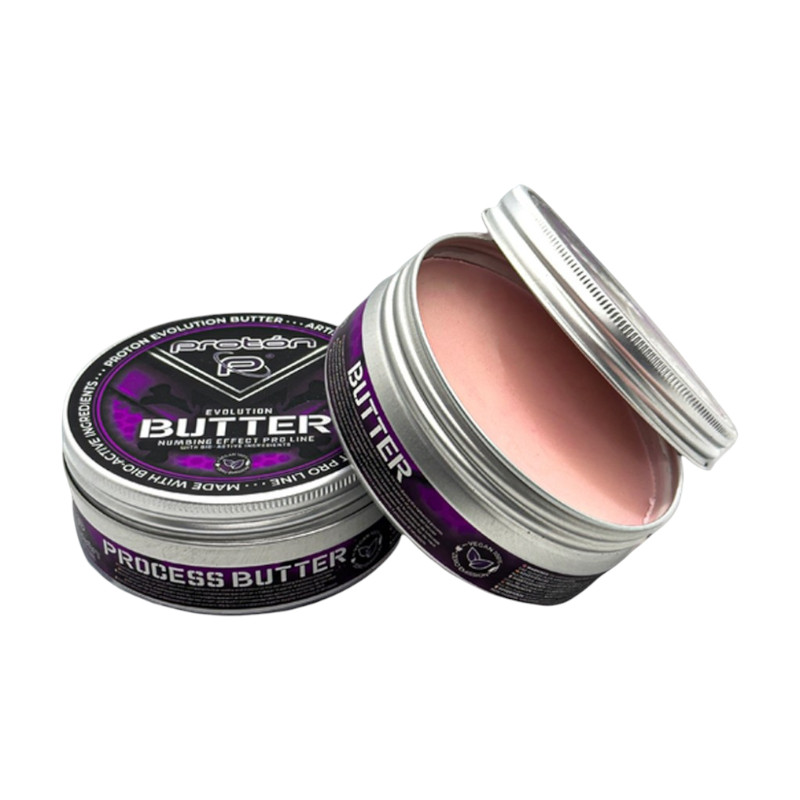 Die Evolution Process Butter von Proton besteht zu 100 Prozent aus natürlichen Inhaltsstoffen und ätherischen Ölen die aus der Natur stammen. Mit einer einzigartigen Mischung aus über 7 natürlichen Inhaltsstoffen bietet diese Butter eine außergewöhnliche Hautpflege während des Tätowierens und sorgt für ein angenehmeres Erlebnis sowohl für den Kunden als auch für den Tätowierer. Die Schmerzlindernde, rötungs und entzündungshemmende Wirkung trägt dazu bei Schwellungen und Rötungen sowie Blutungen zu reduzieren. Es ermöglicht so präzisere Linien und besser definierte Details.