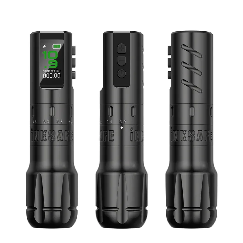 The ELITE Inksafe Flexo Tattoo Pen is the perfect all-rounder for smooth shading, rich fills, and bold outlines. It features the ability to adjust the stroke length using a rotary knob. To set a different stroke length, simply hold the machine by the ring in the middle and turn the upper part. There are 6 markings on the barrel to help you determine the stroke length: 2.0 mm, 2.4 mm, 2.8 mm, 3.3 mm, 3.8 mm, and 4.2 mm. With its comfortable shape and ergonomic, textured grip, the Flexo fits perfectly in your hand. This reduces wrist fatigue during long tattoo sessions. The pen operates very quietly and has minimal vibration. This ensures flawless work and perfect lines. The Jump Start function allows you to work with larger needle cartridge configurations. Simply double-press the power button to activate the jump-start function. The needle depth can be easily adjusted by turning the click mechanism. The large LED display provides real-time information about the operating voltage and remaining battery life. The battery allows for approximately 8-12 hours of tattooing, depending on your usage. Charging time is approximately 2-4 hours. The pen is powered by a 2000 mAh lithium battery and operates in a voltage range of 4-12 V.