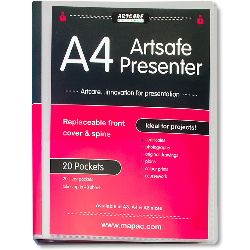 Practical Presenter for your artwork in the size A4. Made of transparent polypropylene with side pockets on the front and spine for an individual look. 20 pockets take up to 40 pages. Preassembled with white paper